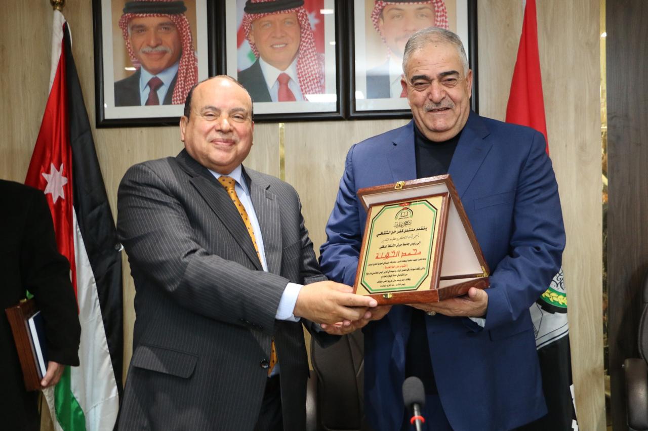 وفي الختام، قام العين فريحات بتكريم كل من رئيس الجامعة الدكتور الخلايلة والنائب حمزة الحوامدة والدكتور محمد المقابلة بدروع تذكارية كما تم تقديم درع تذكاري مقدم من المنتدى على حسن الرعاية والمشاركة في الحوارية.