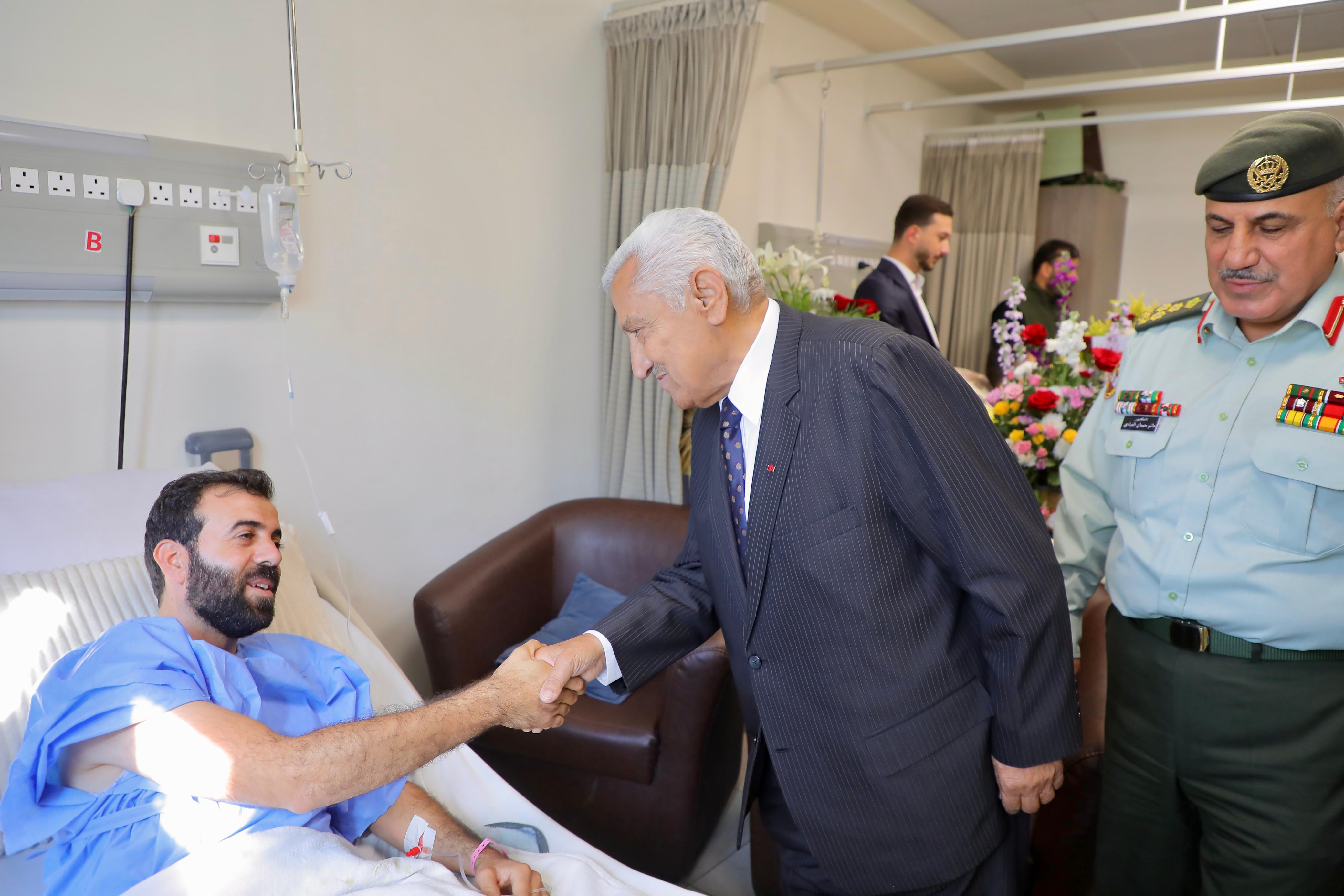 ونقل النسور تمنيات رئيس مجلس الأعيان فيصل الفايز الذي يقوم بزيارة عمل رسمية إلى اليابان، بالشفاء العاجل للمصابين والعودة لأداء واجبهم في خدمة الوطن والحفاظ على أمنه وسلامة مواطنيه، معربًا عن اعتزاز مجلس الأعيان بتضحيات الأجهزة الأمنية ونشامى القوات المسلحة.