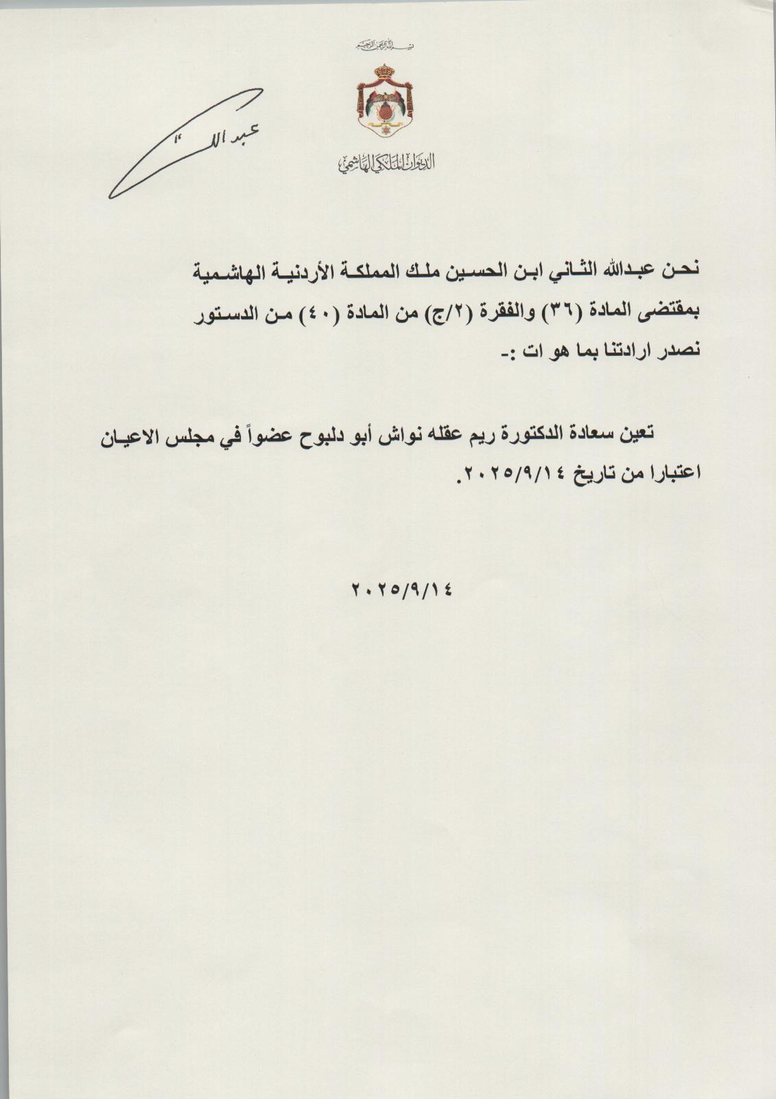 Her Excellency Dr. Reem Aqla Nawash Abu Dalbouh is appointed as a member of the Senate, effective from September 14, 2025.