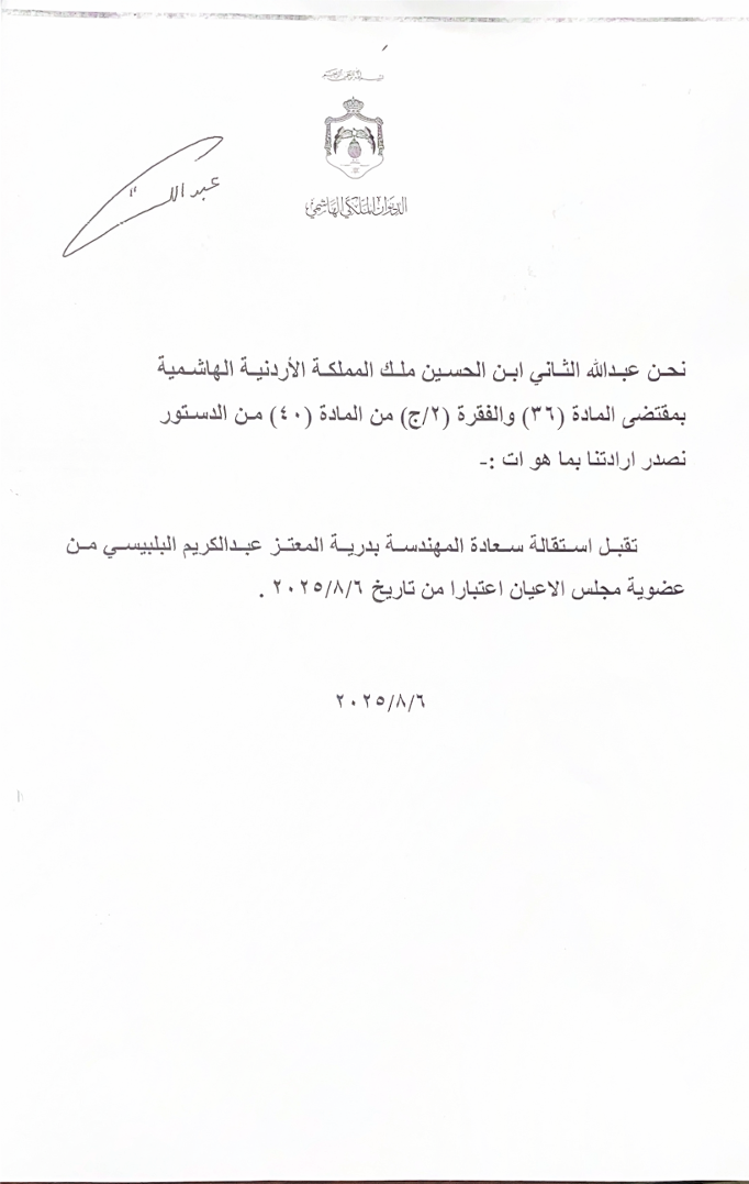 تقبل استقالة سعادة المهندسة بدرية المعتز عبدالكريم البلبيسي من عضوية مجلس الاعيان اعتبارا من تاريخ 2025/8/6.